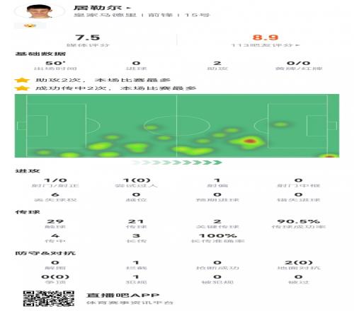 关键表现!居勒尔数据:1射0正2助攻,3次长传全部成功,评分7.5