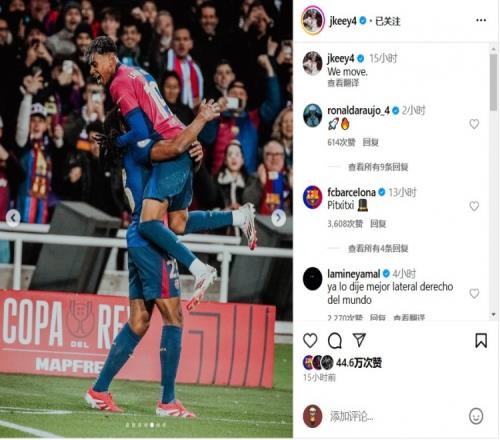 体育资讯1月16日报道宣称 巴萨后卫孔德今天在社交媒体晒照,亚马尔评论称他是世界最佳右后卫。