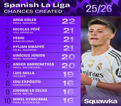 雷速体育10月7日报道宣称 外媒统计了本赛季西甲创造进球机会次数排行榜,皇马中场居莱尔以22次居首,尼古拉斯·佩佩、佩德里以21次紧随其后。