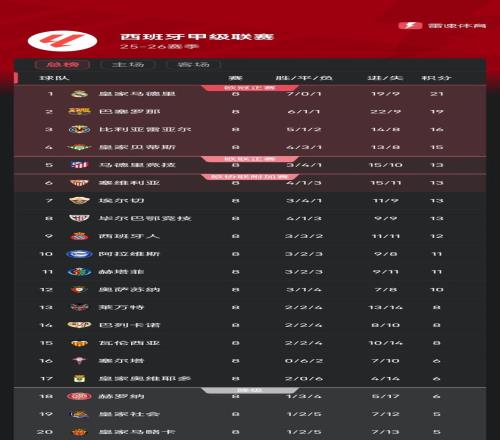 西甲第8轮后积分榜:皇马2分优势领先巴萨,马竞第5