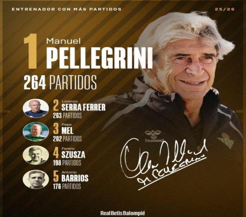 已成传奇!佩莱格里尼以264场成贝蒂斯队史执教场次最多的主教练