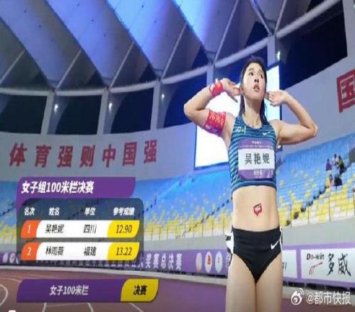 随后进行的女子100米栏决赛中,吴艳妮以12秒90的个人赛季最好成绩率先撞线,福建队的亚运会冠军林雨薇位居第二,成绩是13秒22,另一位福建队选手姜李韵喆以13秒24排名第三。值得一提的是,本次比赛中吴艳妮状态出色,预赛和决赛两枪都突破13秒大关,预赛中她以12秒99的成绩排名第一。