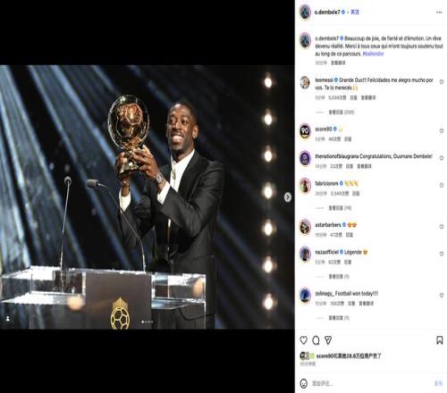 梅西现身登贝莱社媒评论区:你值得拥有金球奖,我为你感到高兴