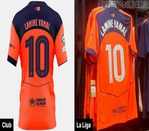 直播吧9月19日报道宣称 著名足球装备网站FootyHeadlines报道,巴萨第三球衣身后印字因为西甲规定只能使用白色字体,效果看起来差多了。