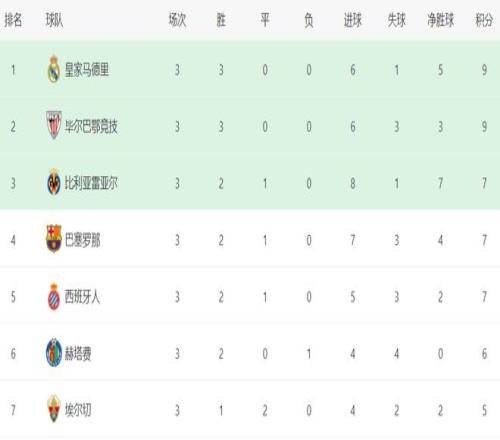 在积分榜上,皇马排名榜首。皇马3战全胜,拿到9分,有5个净胜球。毕尔巴鄂竞技也是3战全胜,拿到9分,但净胜球只有3个,只能够排名第2。第3的是比利亚雷亚尔,2胜1平,拿到7分。而同样7分的巴萨因为净胜球比比利亚雷亚尔少,只能够排名第4。西班牙人也是7分,排名第5。