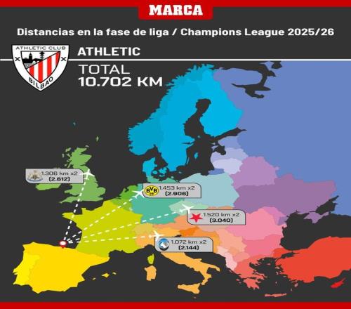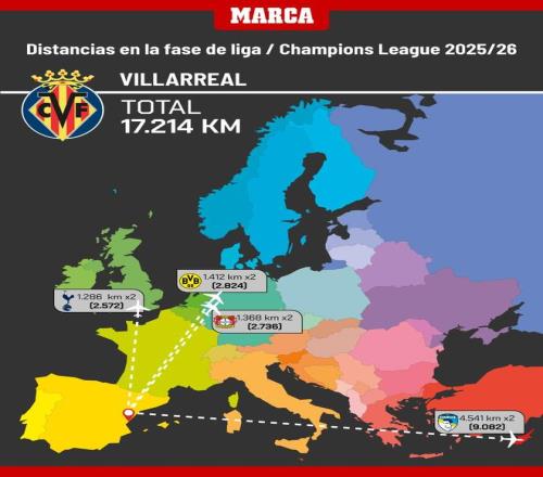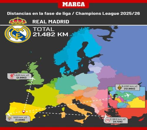 北京时间8月29日凌晨,2025-26赛季欧冠联赛阶段36支参赛队的抽签对手全部出炉。西班牙媒体《马卡报》制图盘点了西班牙5支欧冠球队的往返客场的公里数,其中,皇马因远征哈萨克斯坦以21482km居首,巴萨11008km为其半数,而比利亚雷亚尔因对决帕福斯17214km位列次席。
