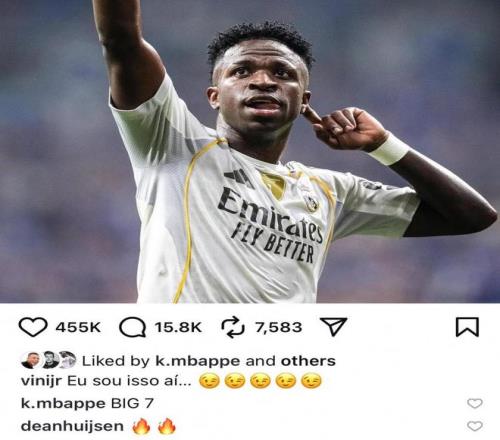 维尼修斯社媒晒照庆祝胜利,姆巴佩点赞评论:BIG7