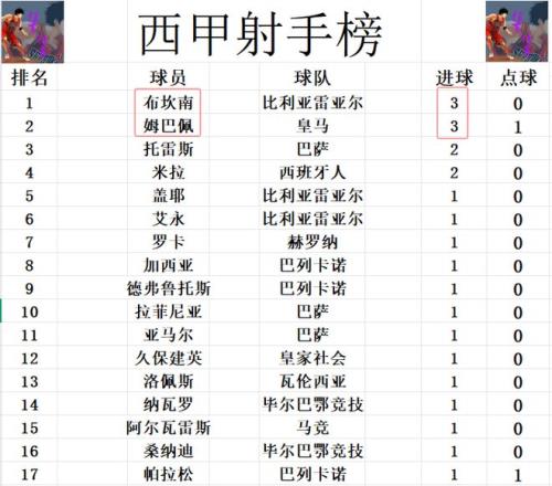 射手榜方面,姆巴佩连场破门,2轮打入3球,布坎南则是新赛季首个上演帽子戏法的球员,两人3球并列第1。米拉也是连场破门,他追上托雷斯,两人2球并列第3。亚马尔,拉菲尼亚,久保建英等人则是1球上榜。