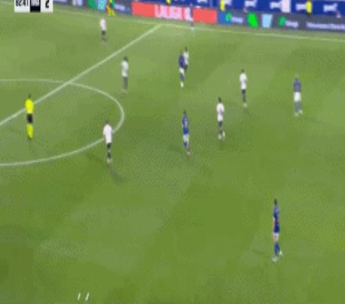 第82分钟,皇马中前场高位逼抢,维尼修斯断球策动反击,维尼修斯带球突到禁区弧顶处巧妙斜塞左侧做饼,及时跟进的姆巴佩禁区左侧又获得单刀良机,姆巴佩依然是稳稳的推射远角得手,姆巴佩梅开二度,皇马2:0领先。第85分钟,皇马再攻,姆巴佩禁区弧顶处大力轰射,埃斯坎德利再次奋勇将球扑出。补时阶段,皇马右路快攻,替补登场的迪亚斯禁区右侧角上横传中路,维尼修斯禁区弧顶处接球往前调整突入禁区,晃开防守后维尼修斯推射球门左下死角,皮球应声入网,皇马3:0锁定胜局。