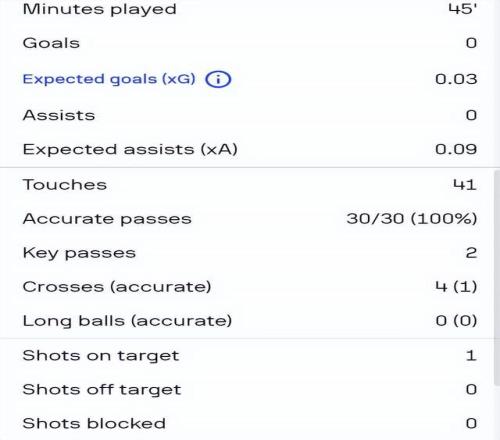 据统计,踢了45分钟的拉什福德,仅有1脚射门,期望进球值仅有0.03。此外在边路,拉什福德也没有创造出什么好的机会,因此弗里克半场过后,就坚决把他换下。踢了半场的拉什福德,赛后拿到6.2分,这是全队最低的分数。在场上,拉什福德确实拖了球队的后腿。