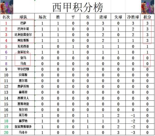 西甲最新积分战报三叉戟各1球巴萨大胜首轮就将压力甩给皇马
