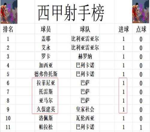 射手榜方面,西甲首轮到目前为止还是没有人能梅开二度,巴萨三叉戟今天都进了球,拉菲尼亚,亚马尔,久保建英,托雷斯,盖耶,罗卡,洛佩斯,帕拉松等人都是1球上榜。
