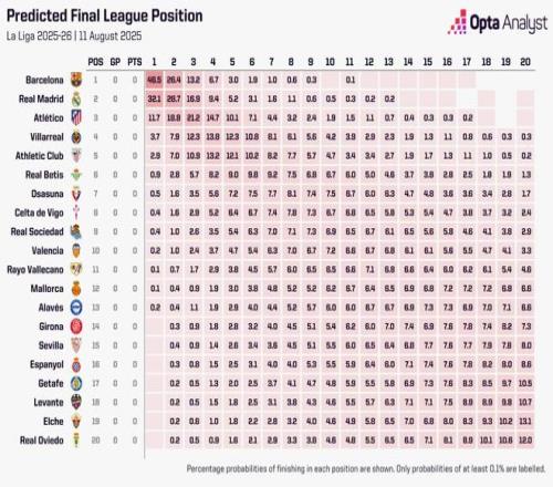 雷速体育8月13日报道宣称 Opta的超级计算机使用 10000 次模拟公布了2025/26赛季西甲排名预测,巴萨46.5概率卫冕冠军,皇马32.1%的概率夺冠。