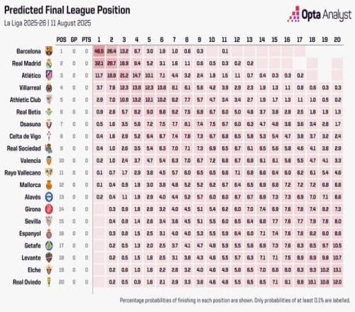2025/26赛季西甲将于周末打响,知名数据机构Opta在开赛前预测了各队的夺冠概率,巴萨是头号热门,皇马位列次席,马竞排在榜单第三位。