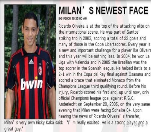 2006年的夏天,米兰耗费了1750万欧元得到了奥利维拉,5年合约和130万欧的年薪着实反映了期望值。