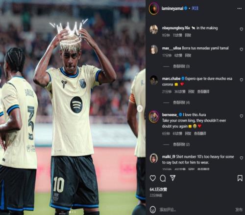 亚马尔晒出图片,图中为自己p上了一座皇冠。