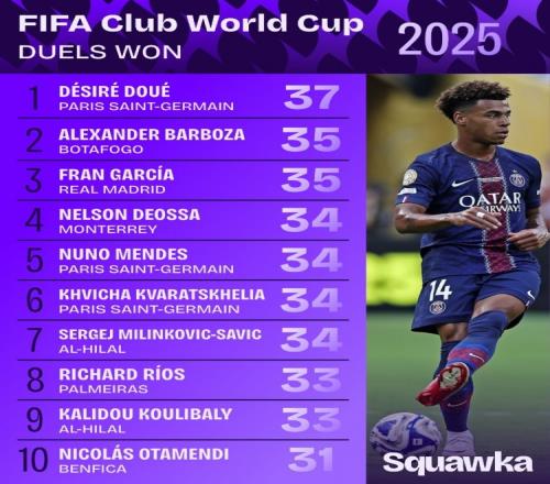 体育资讯7月11日报道宣称 本届世俱杯仅剩巴黎vs切尔西的决赛,数据机构squakwa也统计了本届赛事成功对抗情况,巴黎20岁前锋杜埃领跑。