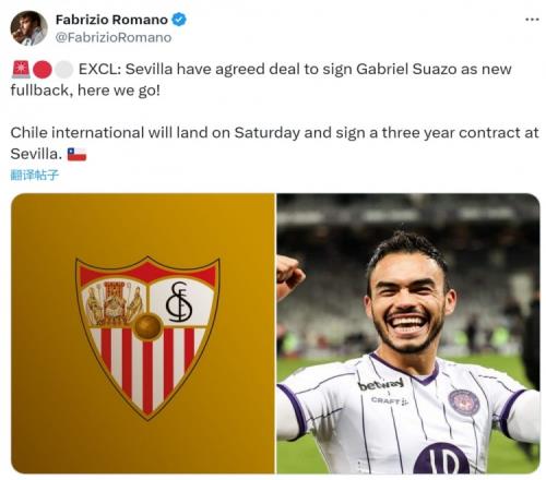 体育资讯7月11日报道宣称 据知名记者罗马诺报道,智利左后卫苏亚佐将免签加盟塞维利亚,Here we go!