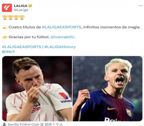 西甲官方社媒晒出拉基蒂奇的照片,配文:“四座西甲奖杯,无数的魔法时刻。感谢你奉献的足球,拉基蒂奇。”