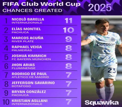 世俱杯小组赛创造机会数top10:巴雷拉11次居首,阿库尼亚9次第三