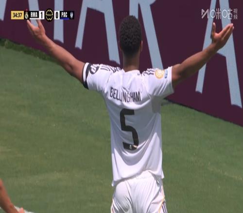 比赛第35分钟,弗兰-加西亚横敲,贝林厄姆突入禁区,左脚抽射破门!场上比分皇马1-0帕丘卡。