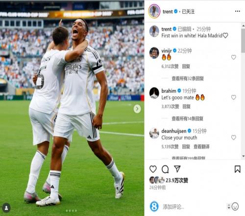 众队友留言点赞!阿诺德社媒晒照:皇马生涯首胜HalaMadrid