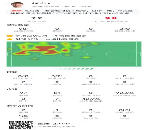 本场比赛,怀森贡献7解围1拦截3抢断0被过的防守数据,他总计12次对抗,成功7次。此外他本场触球有97次,只有7次丢球权,81次传球成功率92.6%。