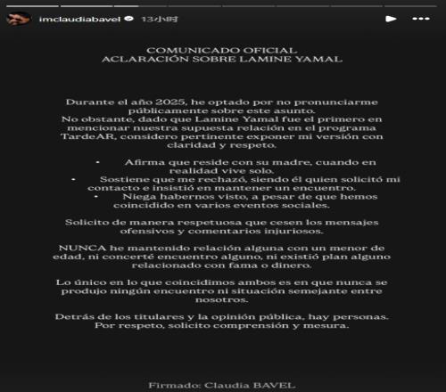 在2025年,我选择不公开谈论这件事。不过既然亚马尔在节目中提到了所谓我们的关联,我觉得有必要清晰且尊重地阐述我的立场。