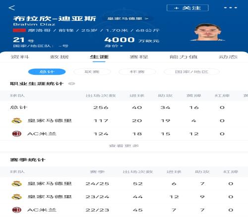 布拉欣-迪亚斯2023年夏窗从AC米兰回归皇马,过去两个赛季共为球队出场96次,打入18球16助攻。