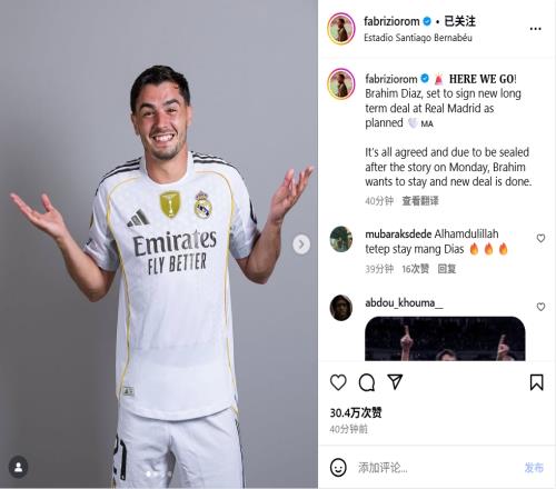 体育资讯06月17日报道宣称 罗马诺用标志性的Here We Go确认,皇马将与摩洛哥边锋迪亚斯续约,双方签订一份长期合同。