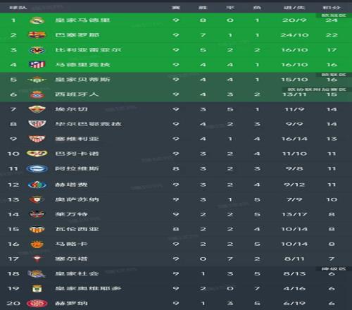 西甲第9轮结束了9场比赛,最新积分榜如下!