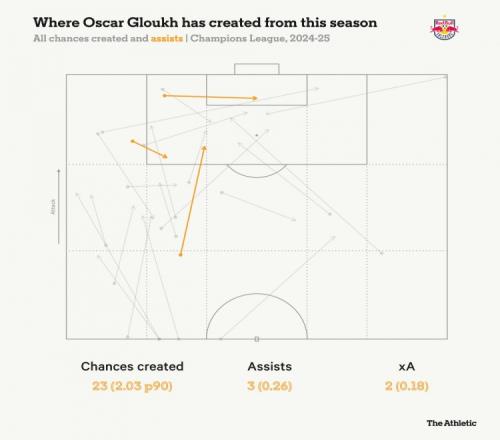 然而,格洛赫依然承担着球队大量的组织进攻职责,在本赛季欧冠联赛中,他创造了23次机会,这一数据是队内第二名的两倍以上。如下图所示,他的许多传球都是直塞球,从左肋部区域犀利地向前穿透找到队友。
