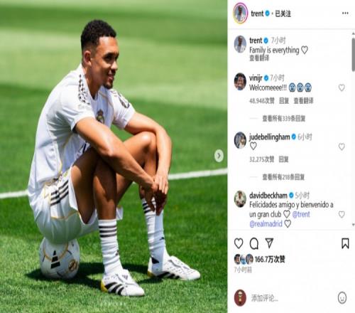 贝克汉姆在阿诺德的动态下方用西班牙语评论道:“恭喜朋友,欢迎来到一个伟大的俱乐部!”