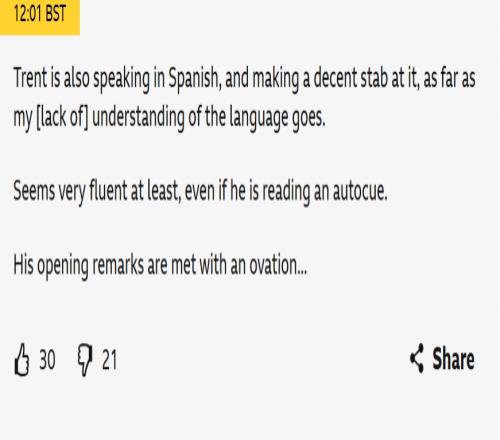 BBC实时博客更新了一段文字:阿诺德也会说西语,而且就我对这门语言的理解,他已经说得不错了,至少听起来非常流利,即使他在看提词器。他的开场白也赢得了热烈的掌声。