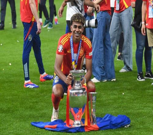 国家队层面,亚马尔为西班牙队出场8次取得3球2助攻,其中欧洲杯决赛送出1次助攻,帮助西班牙夺得欧洲杯冠军,并获欧洲杯助攻王和欧洲杯最佳年轻球员。
