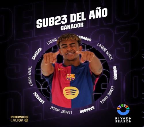 体育资讯6月5日报道宣称 西甲官方宣布,17岁的巴萨攻击手亚马尔当选本赛季西甲最佳U23球员。