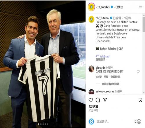巴西新任主帅安切洛蒂及其教练团队来到里约奥林匹克体育场,现场观看博塔弗戈对阵智利大学的比赛,安切洛蒂获赠印有他名字的博塔弗戈7号球衣。