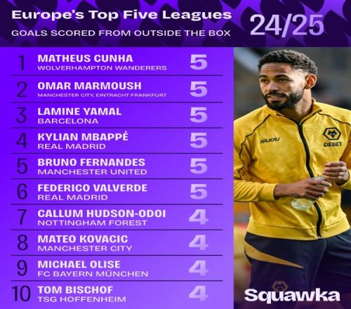 体育资讯5月27日报道宣称 欧洲五大联赛均以落幕,数据网站Squawka统计了2024-25赛季五大联赛球员禁区外破门次数排行榜,库尼亚、马尔穆什、姆巴佩、亚马尔等人都打进5粒禁区外进球。
