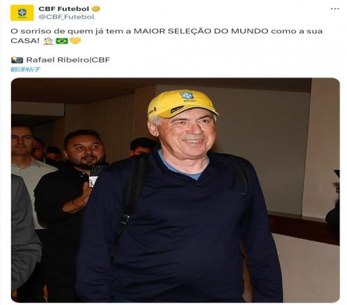 巴西足协社媒晒出安切洛蒂带着巴西队帽子露出笑容的照片,配文:“这是一个拥有世界上最伟大国家队的人脸上的笑容!”