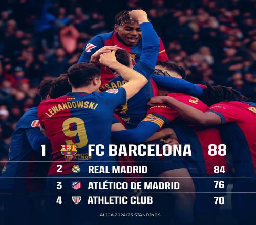 2024/25赛季西甲收官,巴萨最终以88分夺冠,打进102球丢了39球。