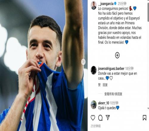 乔安-加西亚发文庆祝,他写道:“我们做到了,鹦鹉军团!这并不容易,但我们实现了目标,西班牙人将在西甲再战一年,这是球队应得的。非常感谢大家的支持,你们的支持让我们坚持到最后,这是你们应得的。”