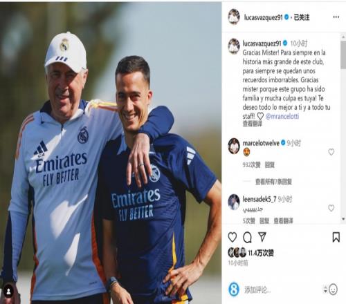 巴斯克斯社媒晒出与安切洛蒂的合照,并写道:“谢谢你,教练!您将永远载入这家俱乐部最伟大的史册之中,留下永不磨灭的回忆。”