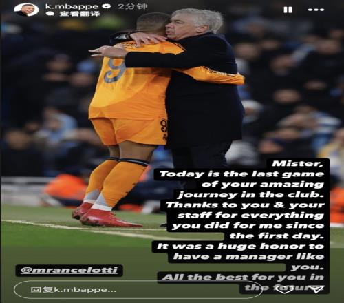 姆巴佩更新社交媒体晒照发文告别安切洛蒂。