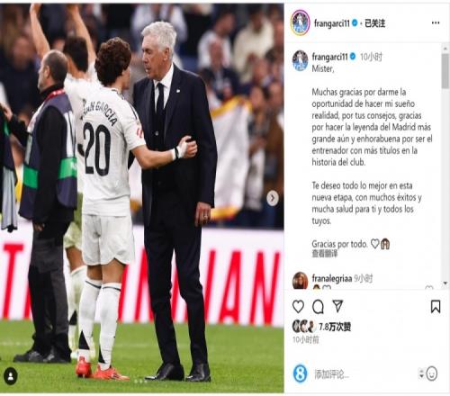 体育资讯5月24日报道宣称 皇马主帅安切洛蒂今夏离任,弗兰-加西亚更新社媒动态,与安帅告别。