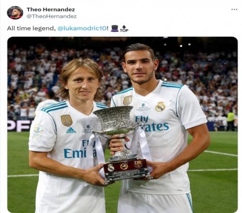 特奥社媒晒出效力皇马时期与莫德里奇的合照,并配文:“永恒的传奇,莫德里奇。”