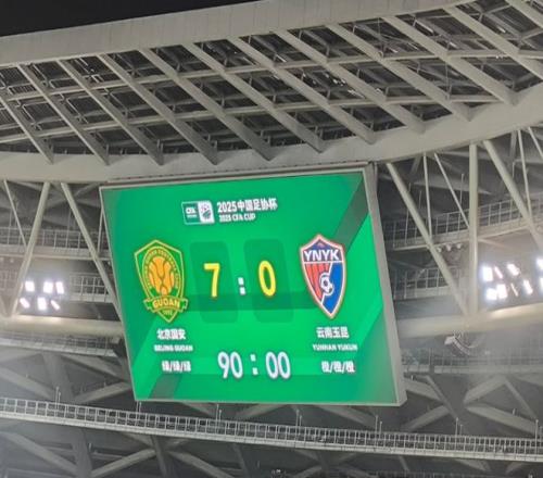 在少一人的情况下,玉昆一溃千里。王刚、古加、林良铭、江文豪、张稀哲、张玉宁各入一球,国安以7比0的比分战胜玉昆,在晋级足协杯决赛的同时,也创造队史足协杯最大比分取胜纪录。