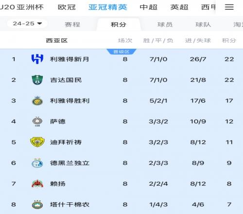 体育资讯2月19日报道宣称 亚冠精英联赛小组赛阶段比赛已落下帷幕。西亚区方面,三支沙特联球队利雅得新月、吉达国民和利雅得胜利位居前三位,剩余晋级球队为:萨德(卡塔尔联)、迪拜祈祷(阿联酋超)、德黑兰独立(伊朗超)、赖扬(卡塔尔联)和塔什干棉农(乌兹超)。
