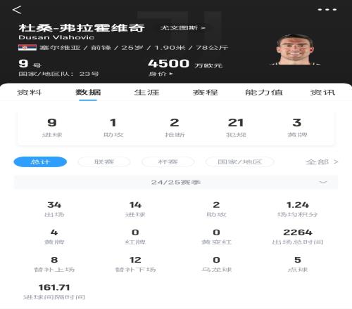 本赛季至今,弗拉霍维奇出战34场比赛,贡献14球2助,尤文战绩不佳,近日已经官宣主帅莫塔下课,由图多尔接任。