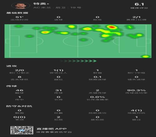 体育资讯2月19日报道宣称 欧冠淘汰赛阶段附加赛次回合,米兰对阵费耶诺德的比赛正在进行。特奥染红离场,出场51分钟获评6.1分。