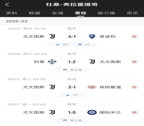 2月份至今尤文的4场比赛,弗拉霍维奇2场未登场,2场替补,打入1球。